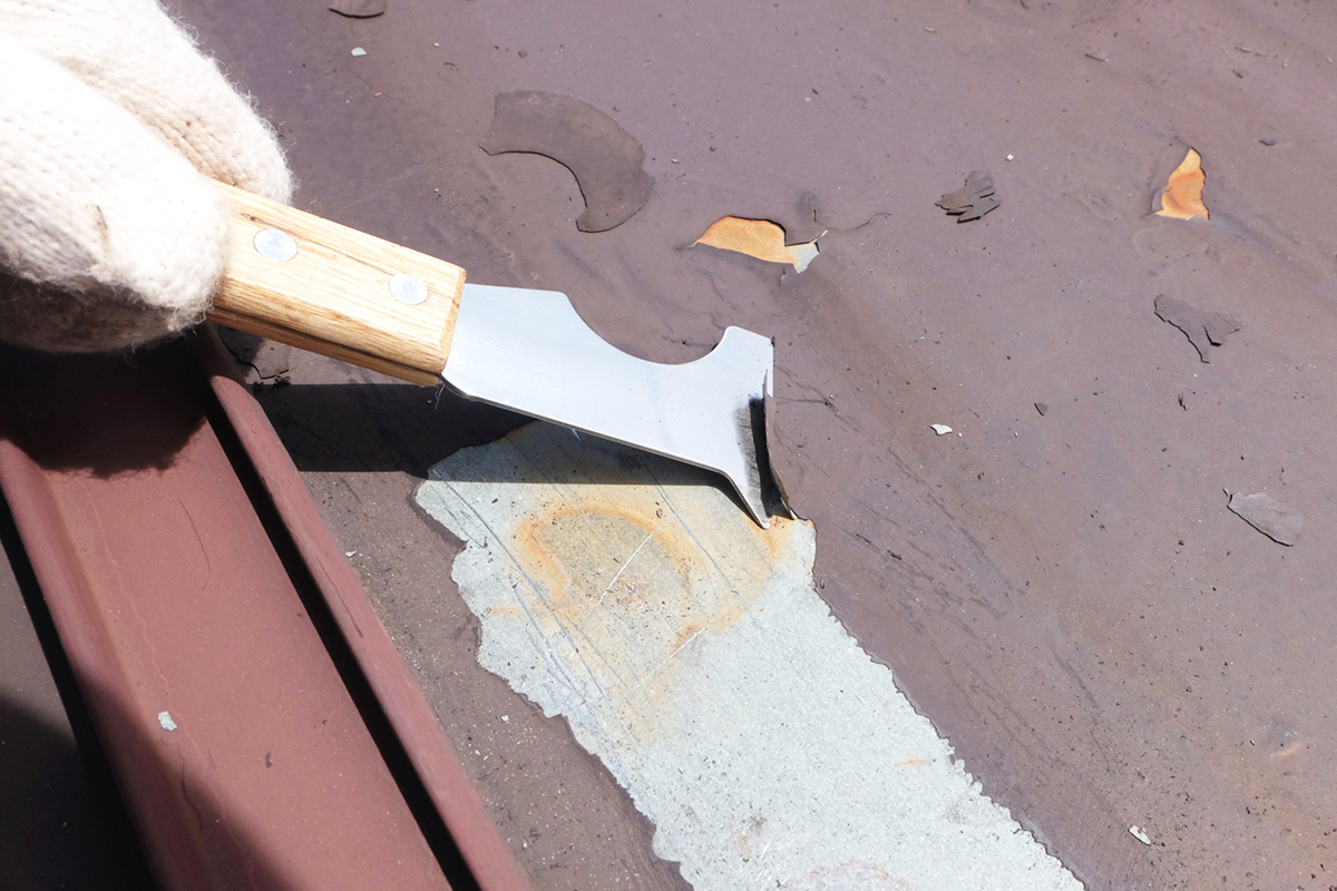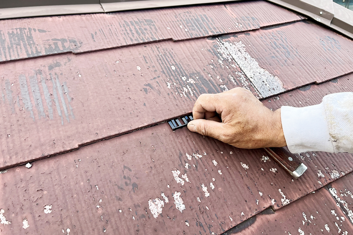 これをしないと、屋根内部の湿気を逃すこともできず、また毛細管現象によって、逆に雨水が侵入してしまうのです。また、棟鈑金などの金属箇所には、ケレンをします。ケレンは表面を磨き、塗料との接着をよくする効果があります。