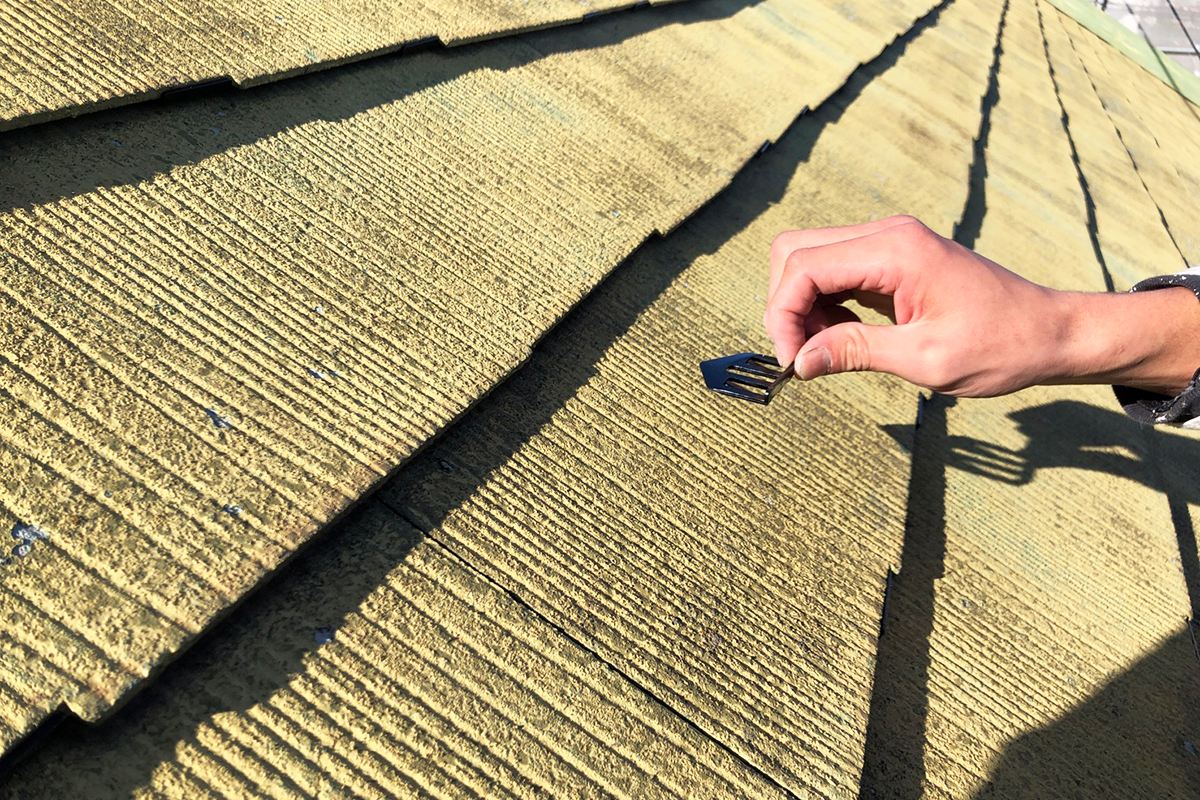 「コロニアル」や「スレート」と呼ばれる薄い板状の屋根材の場合、塗装によって屋根材の重なり部分が塗料で塞がれてしまうことがあります。 すると、わずかな隙間から入り込んだ雨水が排出されなくなり、毛細管現象によって屋根の下地を腐らせ、雨漏りの原因となってしまいます。 すまいる美装では、この現象を防ぐために「タスペーサー」という専用の部材を屋根材の隙間に挿入し、水の通り道を確保する「縁切り」作業を標準で行います。屋根塗装の「一手間」を惜しまないことが、お家を長く守ることに繋がります。
