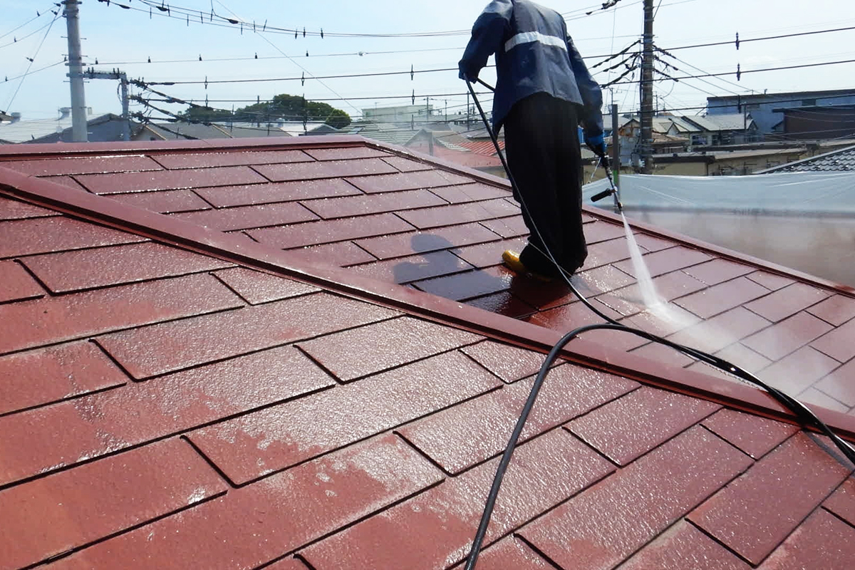 まず、屋根を高圧洗浄して汚れを落とします。洗浄を軽視してはいけません。
